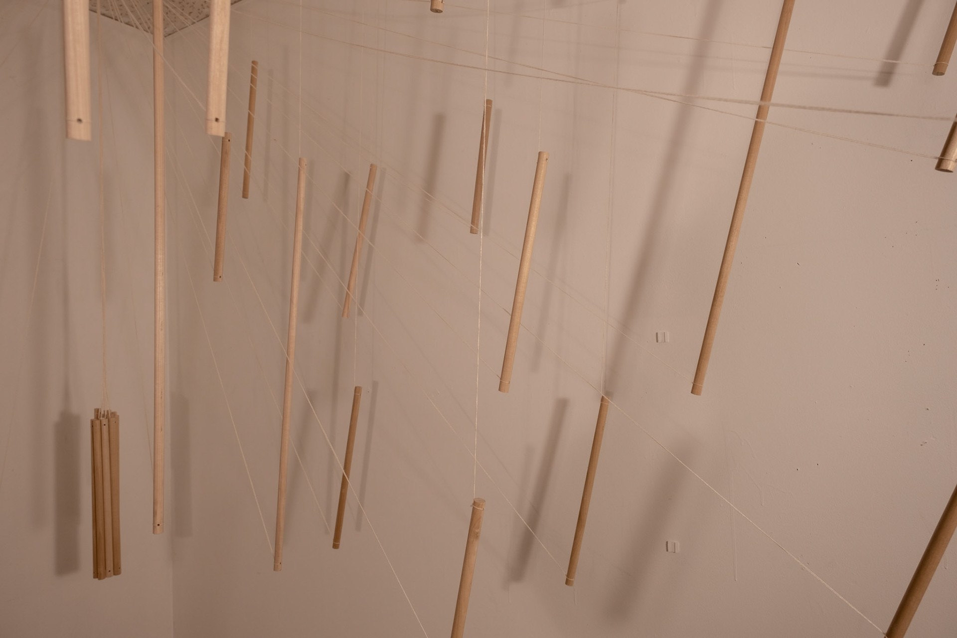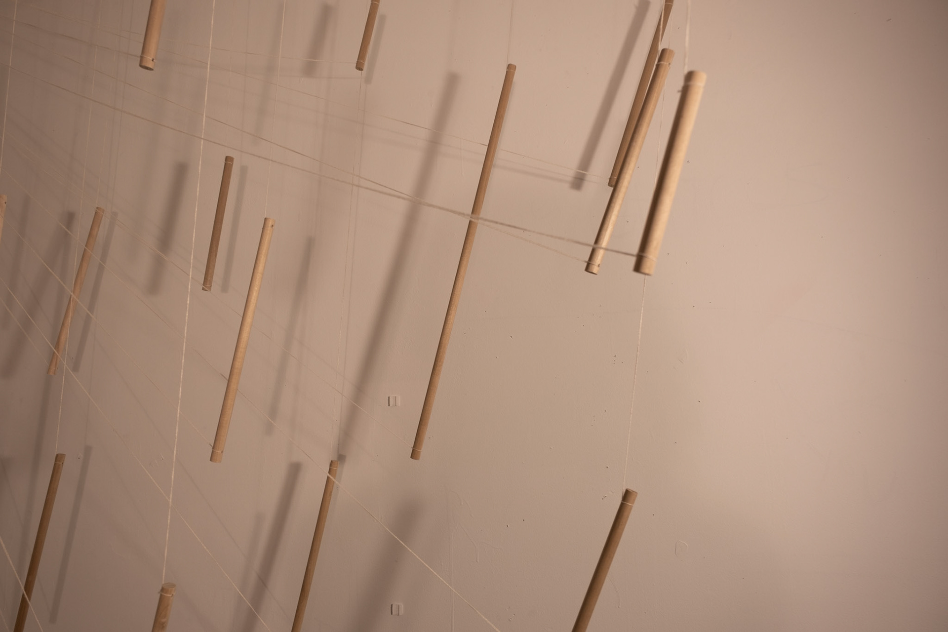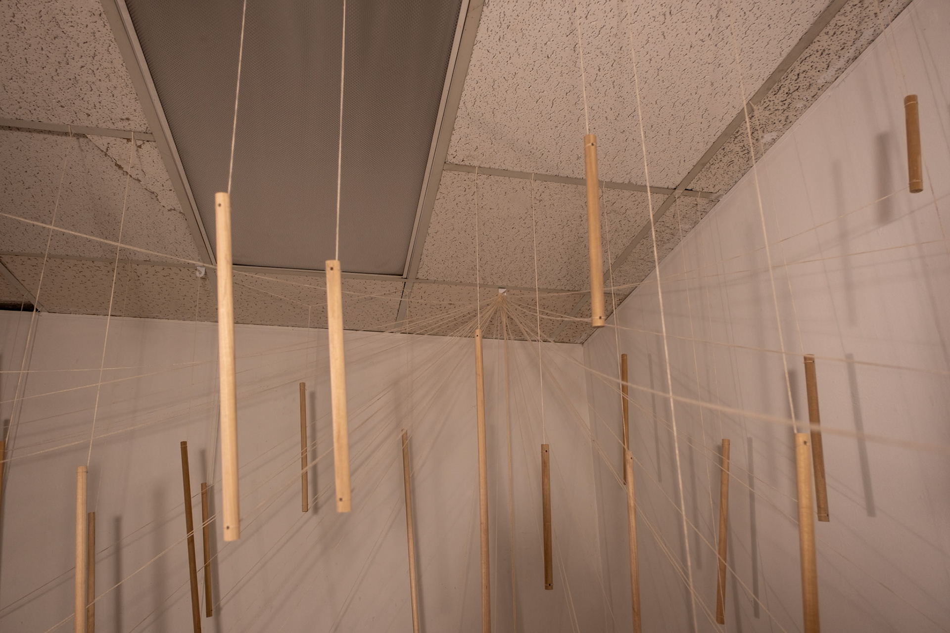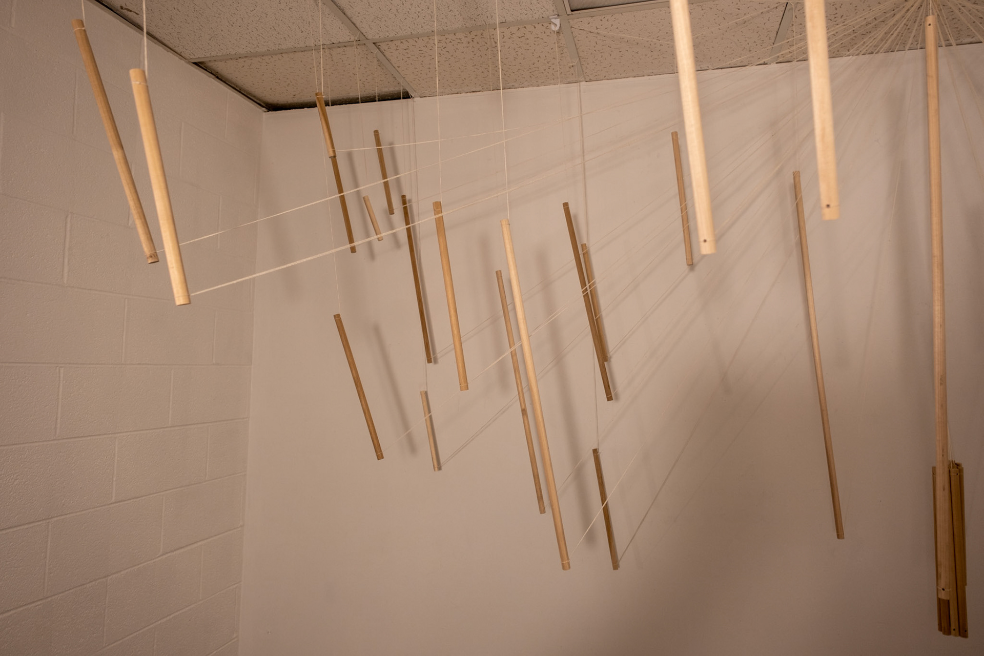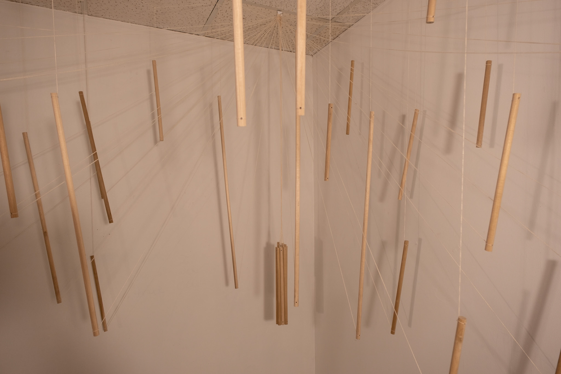 This installation invites the viewers to enter the room one at a time to play and hit the dowels with a wooden wand. The idea was inspired by the children's musical instrument "Boomwhackers."